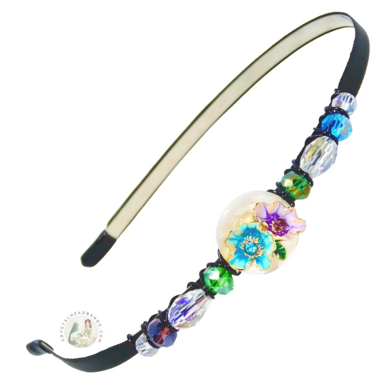 Discover effortless elegance with this radiant headband, where vibrant floral designs meet shimmering Austrian crystal accents.