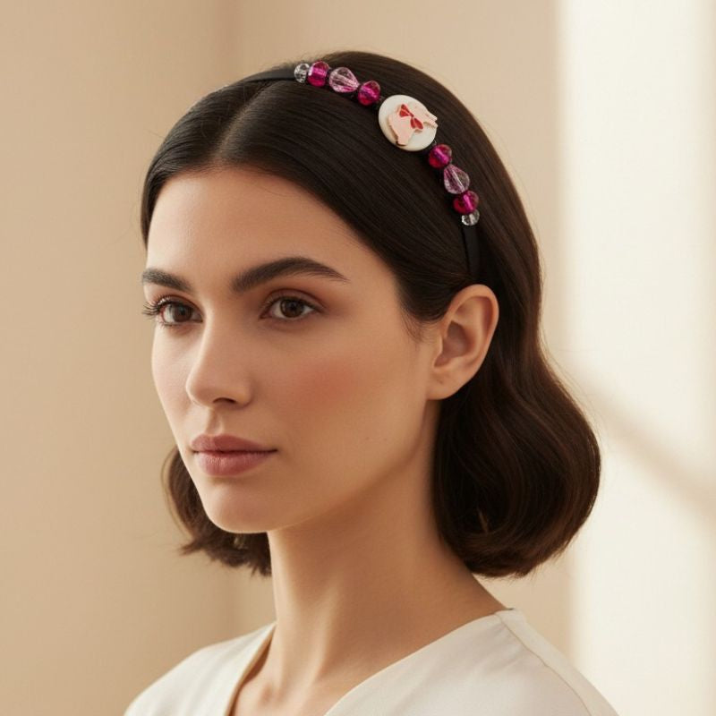 woman wearing pink bunny embellished flexible headband side-accented with Czech crystal beads, Cute Bunny Headband